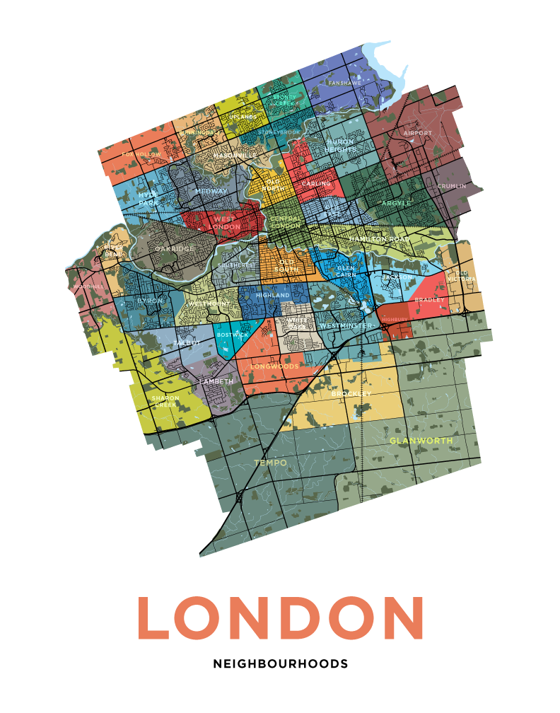 London, ON Map Coloured Neighbourhoods Print Etsy